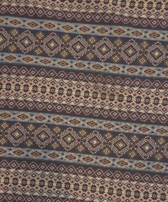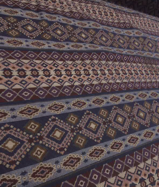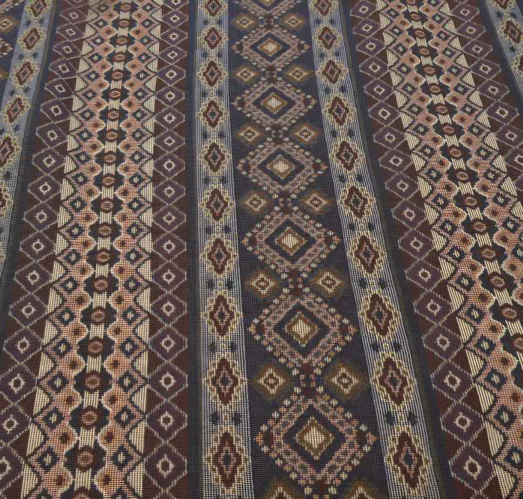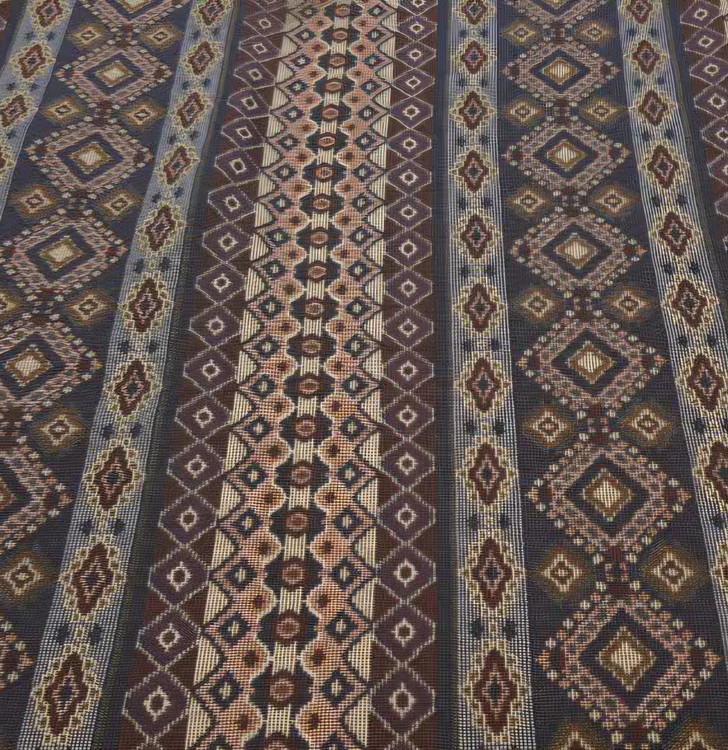 طرح و الگو: الگوی راه راه (عمودی) بافتهشده از نوارهای متناوب. هر نوار شامل مجموعهای فشرده از نقوش هندسی ریز، لوزیها و گرهها است که چشم را خیره میکند و حال و هوای یک سفرهی مجلل را میسازد.