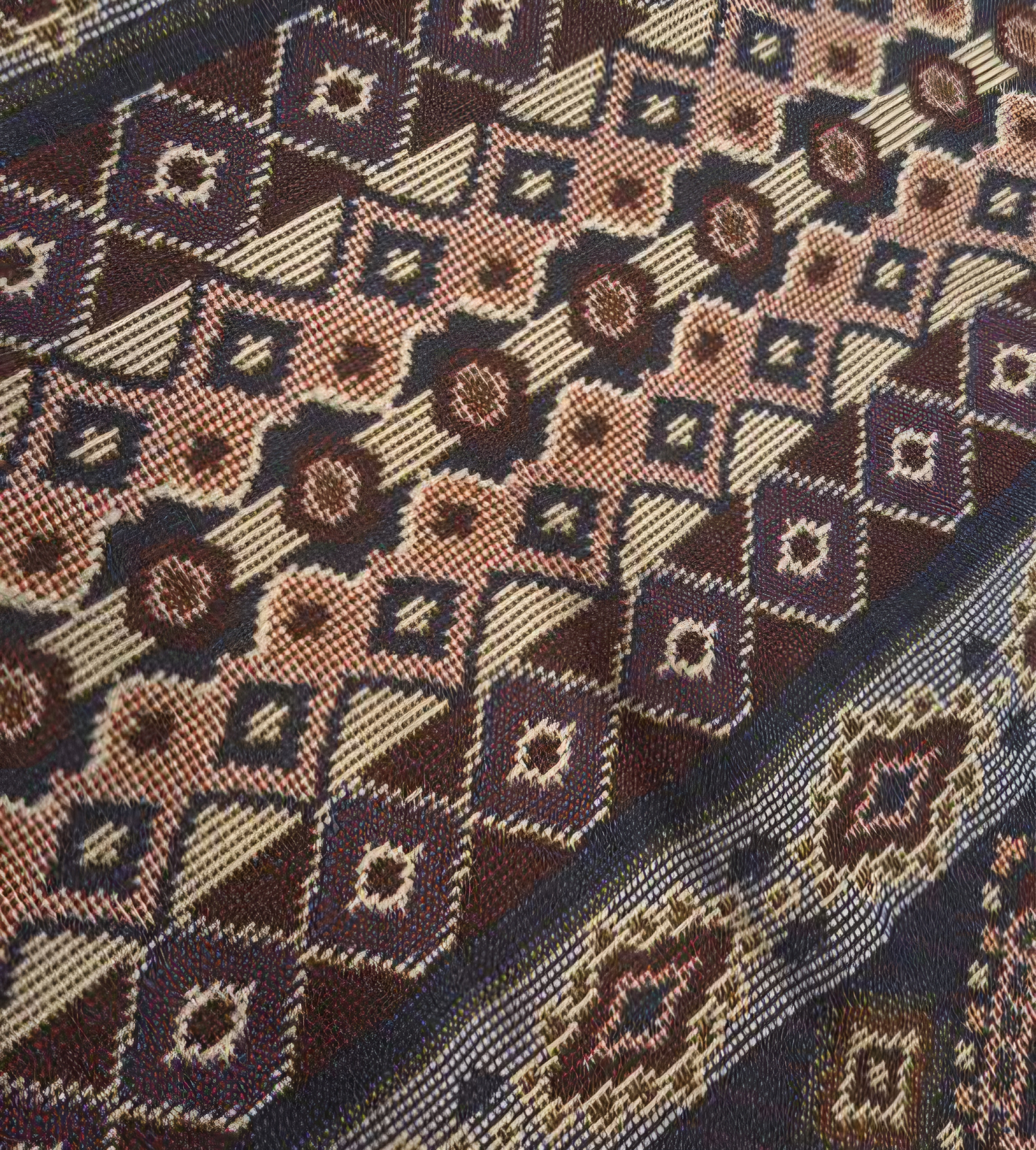 تنوع رنگی (اَلَوان): بازی رنگها در این طرح منحصر به فرد است؛ ستونهای اصلی تیره (مانند سرمهای، زرشکی و قهوهای سوخته) با نوارهای روشنتر و گرمتر (مانند بژ، آجری و طلایی) در هم آمیختهاند تا یک پالت رنگی غنی و جذاب ایجاد کنند.