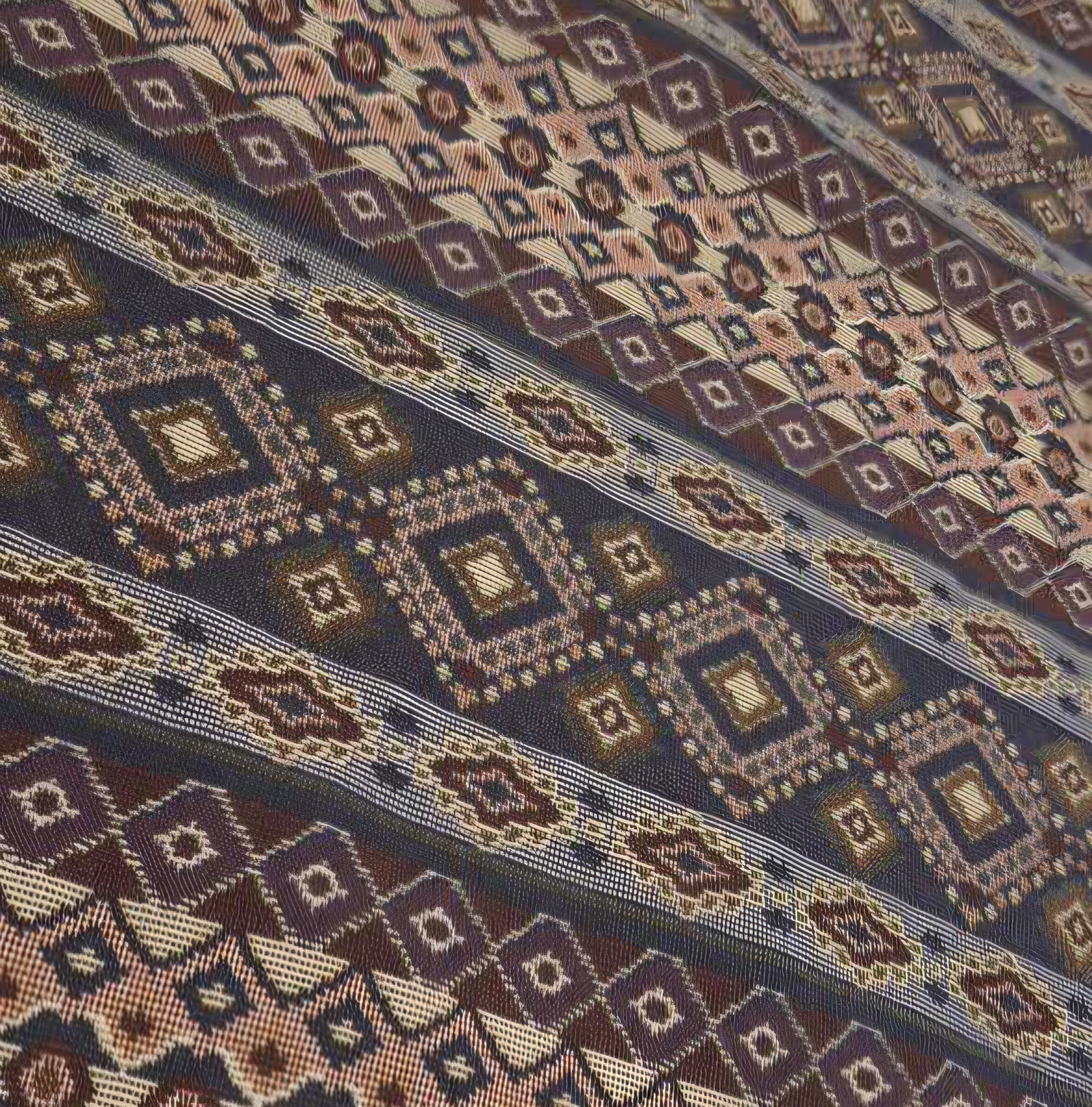 طرح و الگو: الگوی راه راه (عمودی) بافتهشده از نوارهای متناوب. هر نوار شامل مجموعهای فشرده از نقوش هندسی ریز، لوزیها و گرهها است که چشم را خیره میکند و حال و هوای یک سفرهی مجلل را میسازد.